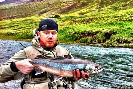 „Undirritaður veiddi bleikjuna á myndinni að ofan, þann 2. ágúst 2011 og reyndist hún vera merkt. Hún var þá 65cm. og var sleppt eftir snarpa viðureign og myndatöku. Þann 1.ágúst sl. veiddi sá sem þetta skrifar svo stærðarinnar bleikju á nánast sama blettinum og hina fyrri eða á Jökulbreiðunni á svæði 5 í Eyjafjarðará. Sú reyndist líka merkt og var hvorki meira né minna en 71cm. Við nánari eftirgrennslan reyndist þarna um sama fiskinn að ræða og veiðimaðurinn hafði glímt við sumarið 2011, haft sigur og sleppt aftur í ánna, nánast þremur árum fyrr upp á dag. Það má leiða að því líkum að þessi fiskur sé um það bil 9 pund og gott til þess að vita að hún syndir enn um hylji Eyjafjarðarár og muni auka kyn sitt enn eina ferðina.