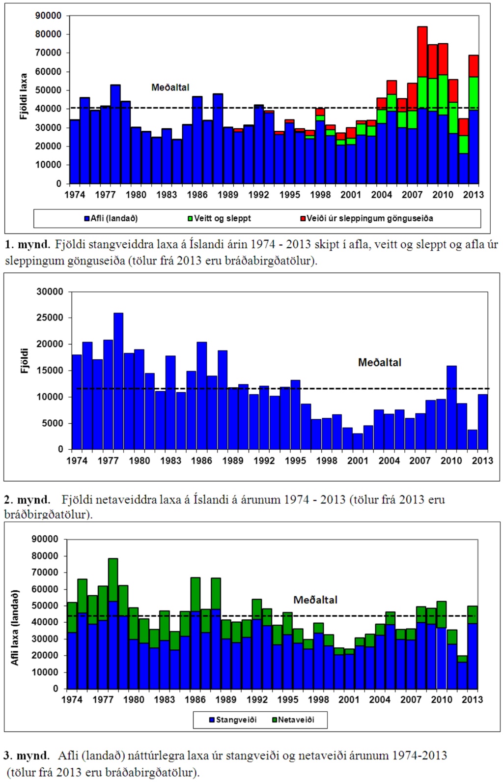 Af þeim 69 þús löxum sem veiddust, komu um 12 þús. laxar úr ám sem byggja veiði á sleppingum gönguseiða sem alin eru í eldisstöðvum. Enn fremur kemur fram að sumarið 2013 var 4. besta stangveiðisumarið á þeim 40 árum sem mælingar taka yfir. Einungis árin 2008-2010 voru betri.