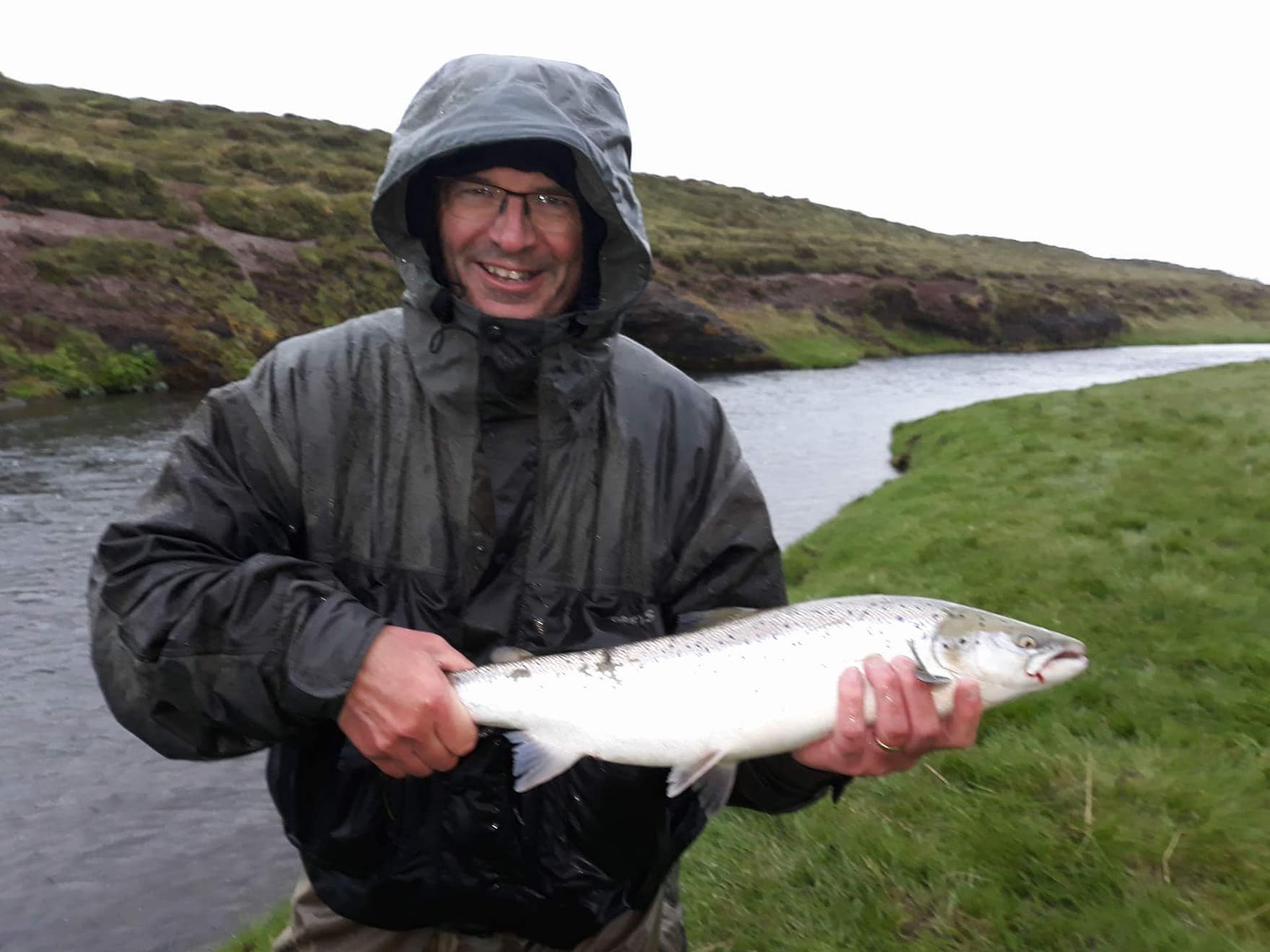 Mynd: Veiðimaður með fyrsta laxinn úr Myrarkvisl sumarið 2018