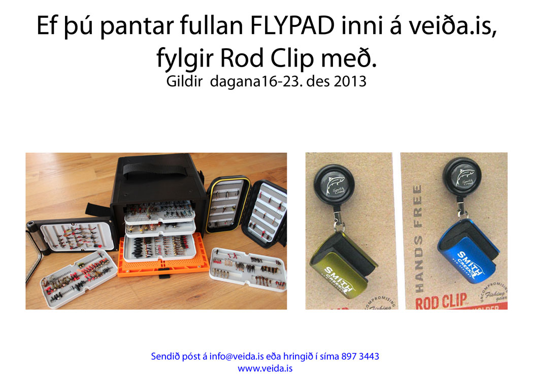 Það styttist í jólin og enn og aftur viljum setja fram smá gjafatvennu. Frá deginum í dag og fram að jólum þá mun Rod Clip, besti nýji veiðiaukahluturinn á fluguveiðisýningunni í Las Vegas 2012, fylgja með fullum FLYPAD sem keyptur er af veiða.is. Fullur FLYPAD inniheldur 8 staka bakka, 2 flugubox með bakka og kassan sjálfan. Fullur FLYPAD getur rúmað allt að 1.300 flugur.